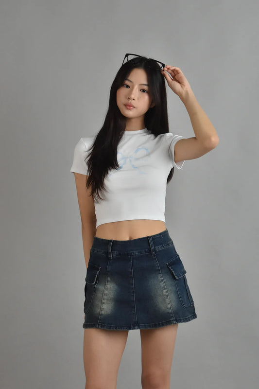 Hanni Plaid Ribbon Cropped Baby Tee in Blue