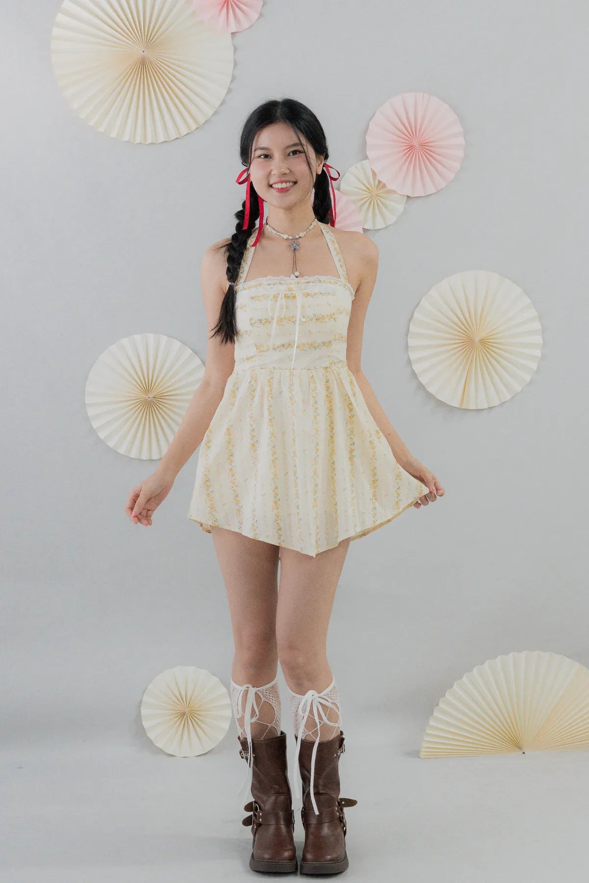 Jodi Padded Halter Romper Dress features a flattering halter neckline with built-in removable padding for easy, fuss-free wear. Designed with a flowy skirt overlay and concealed romper fit, it combines comfort and style. Available in baby blue and yellow, perfect for CNY visits, brunch dates, or weekend outings with friends.