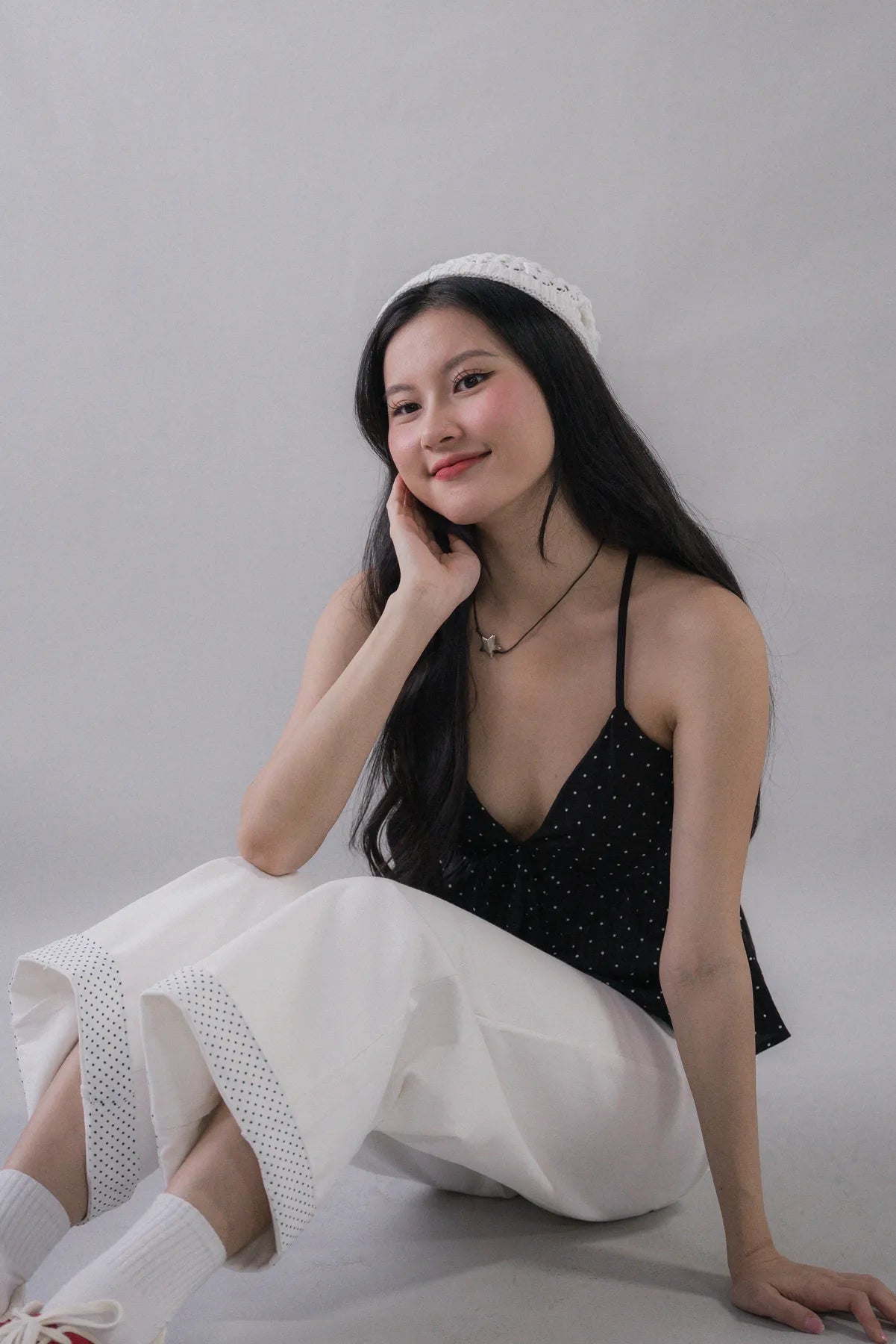 Jamie is the pair that truly does it all. These wide-leg jeans feature a structured high-waist fit and a soft flare that instantly lengthens your silhouette. The signature cuff comes in polka dot or checkered prints, and you can fold it down for a clean, minimal look. The matching patterns also appear on the back pocket, making this a standout piece from every angle.