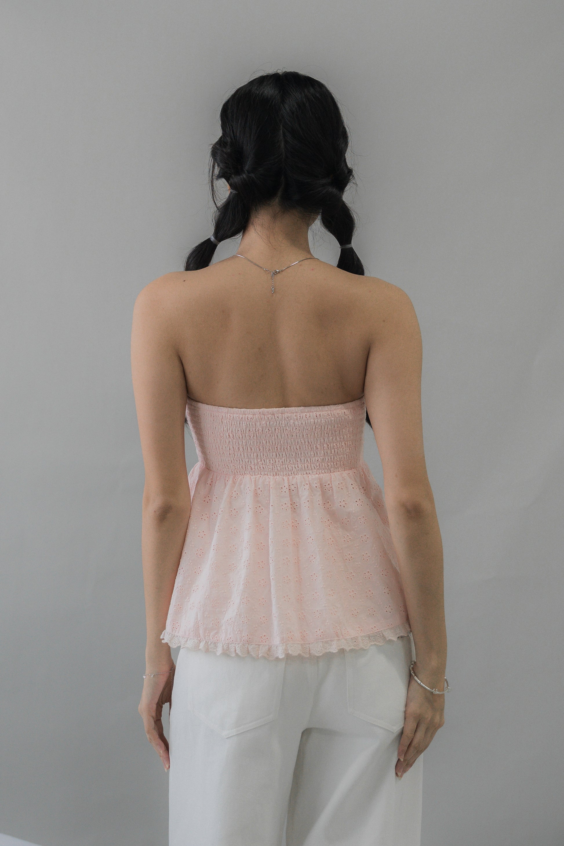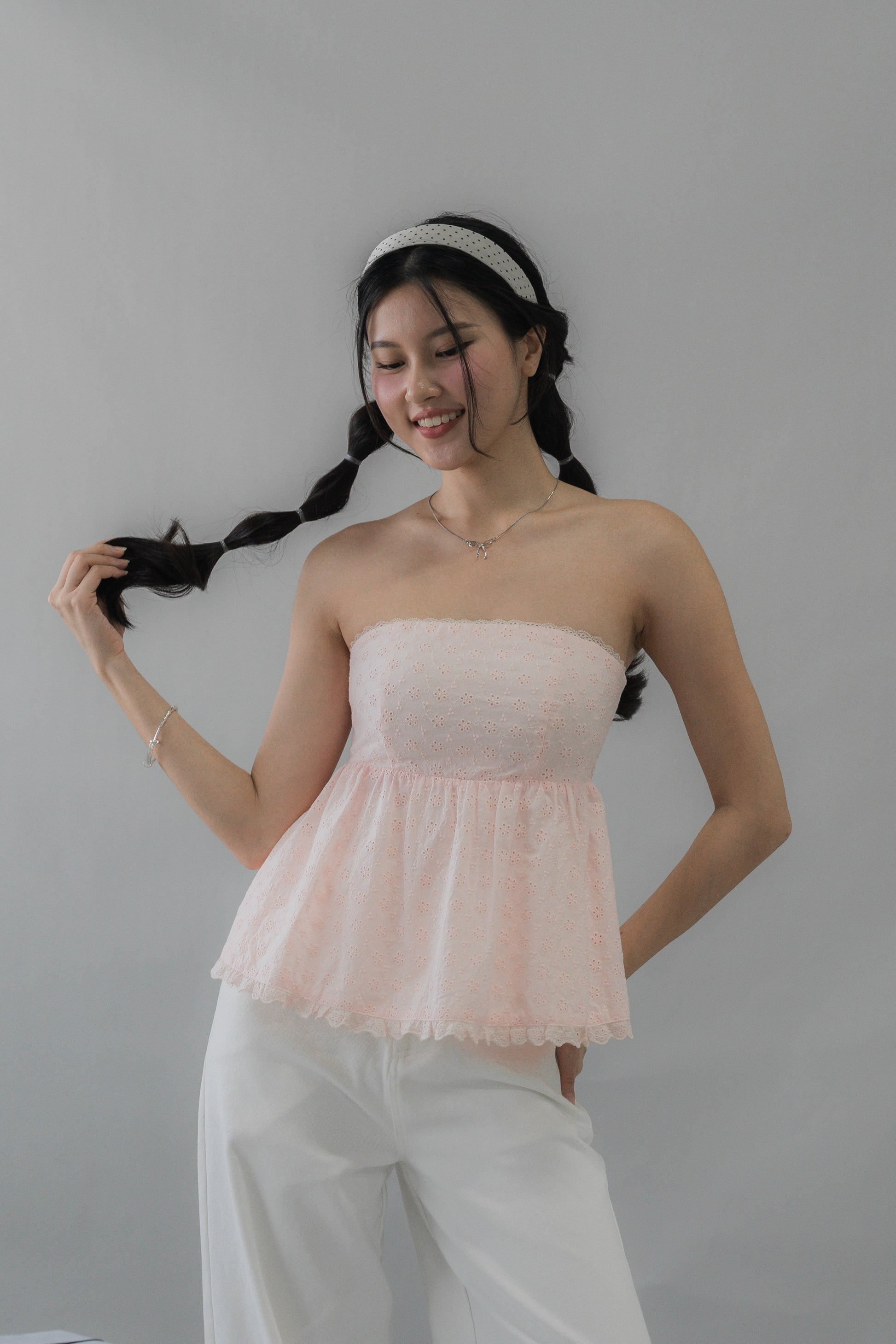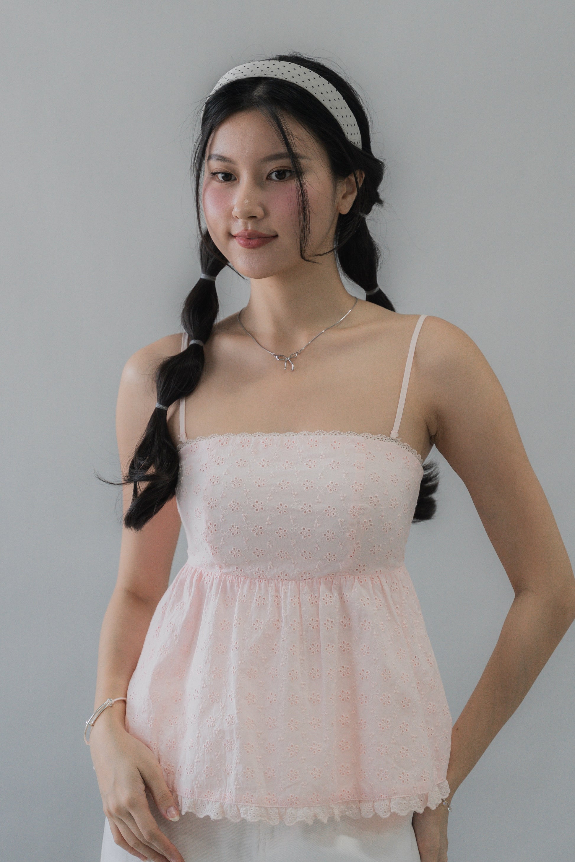 Jolyn – Soft, sweet, and effortlessly dreamy. Crafted from delicate eyelet fabric with scalloped lace edges, this padded babydoll top brings a touch of romance to your everyday wardrobe. The best part? Its removable straps let you switch things up—wear it as a cami or a tube, depending on your mood.