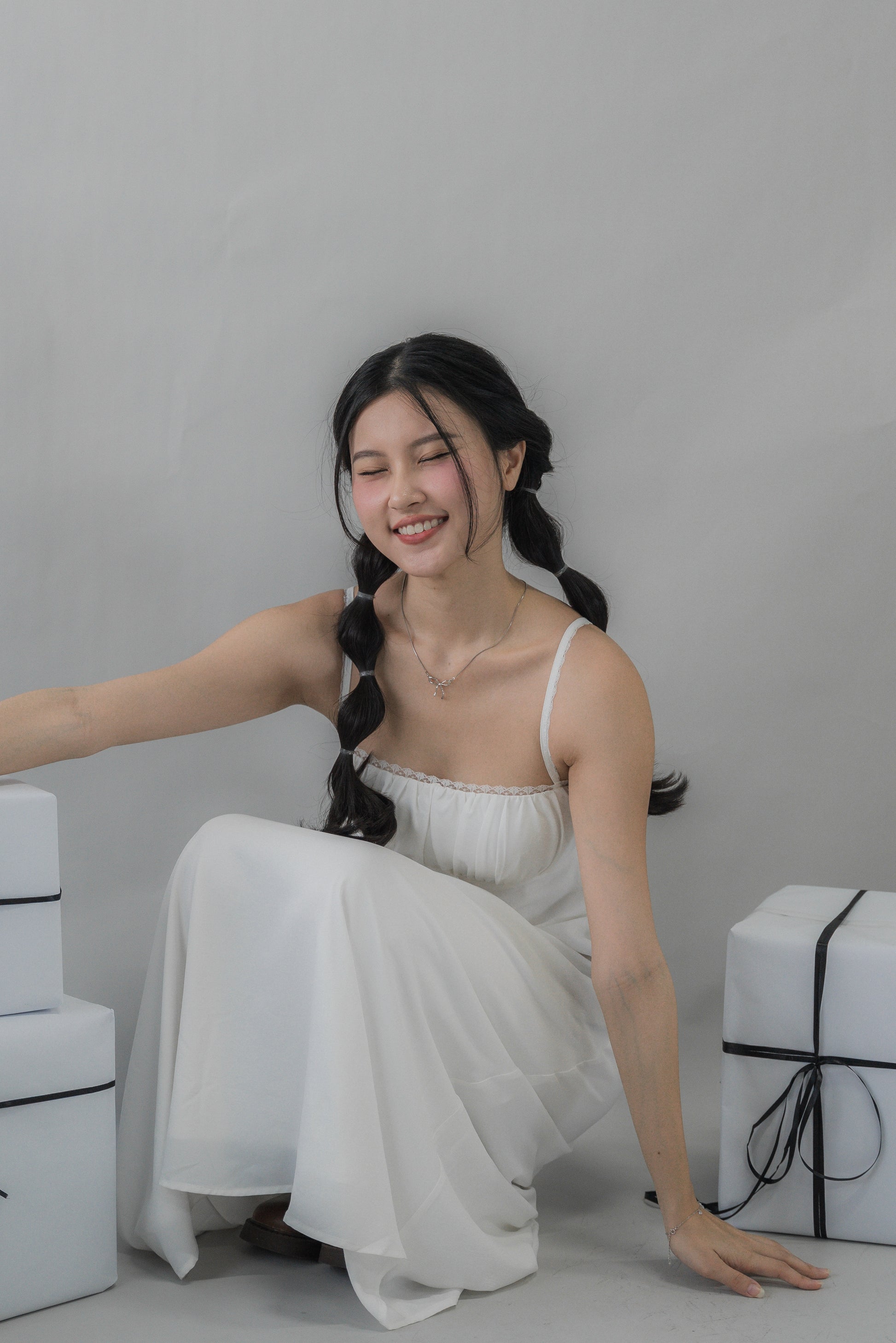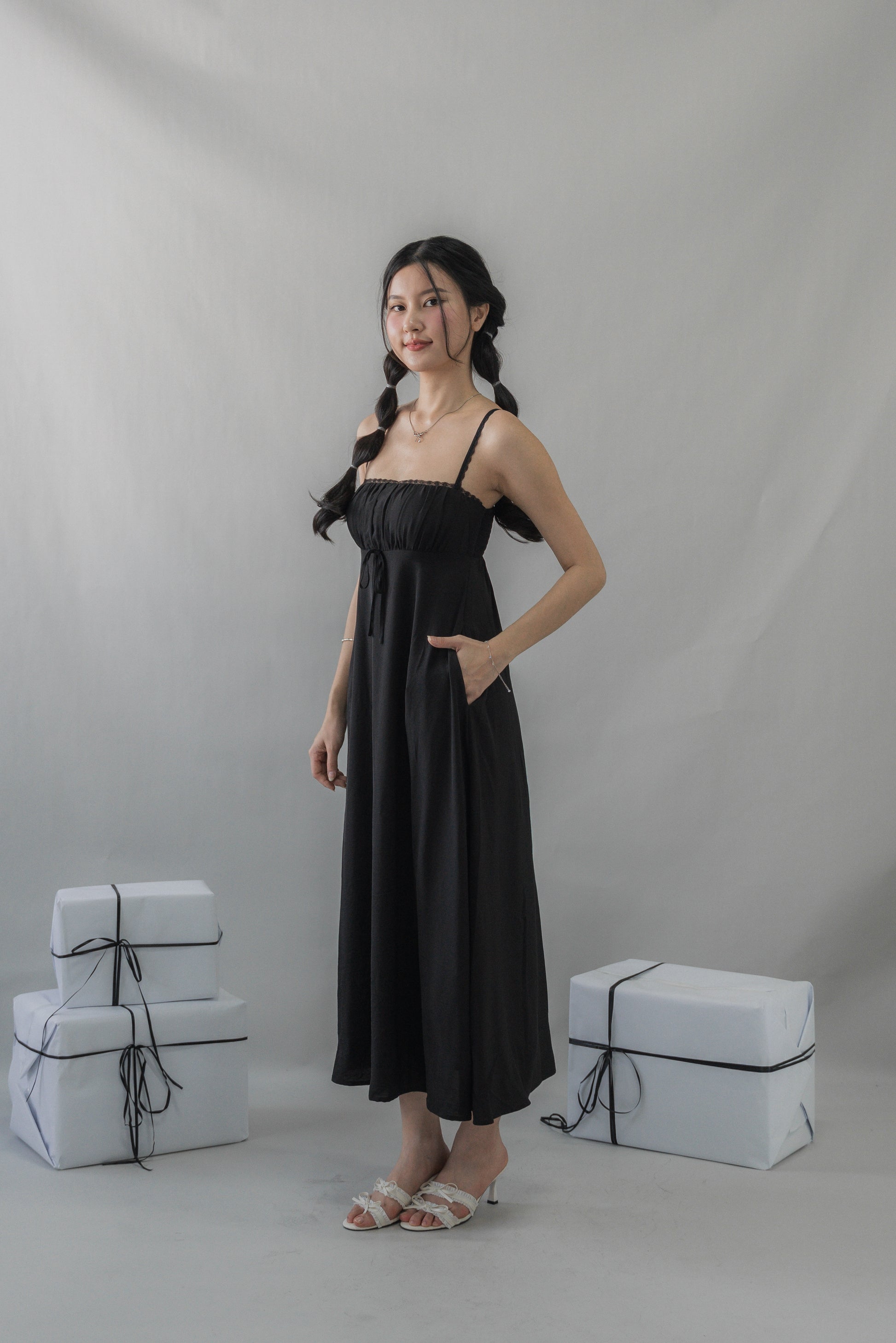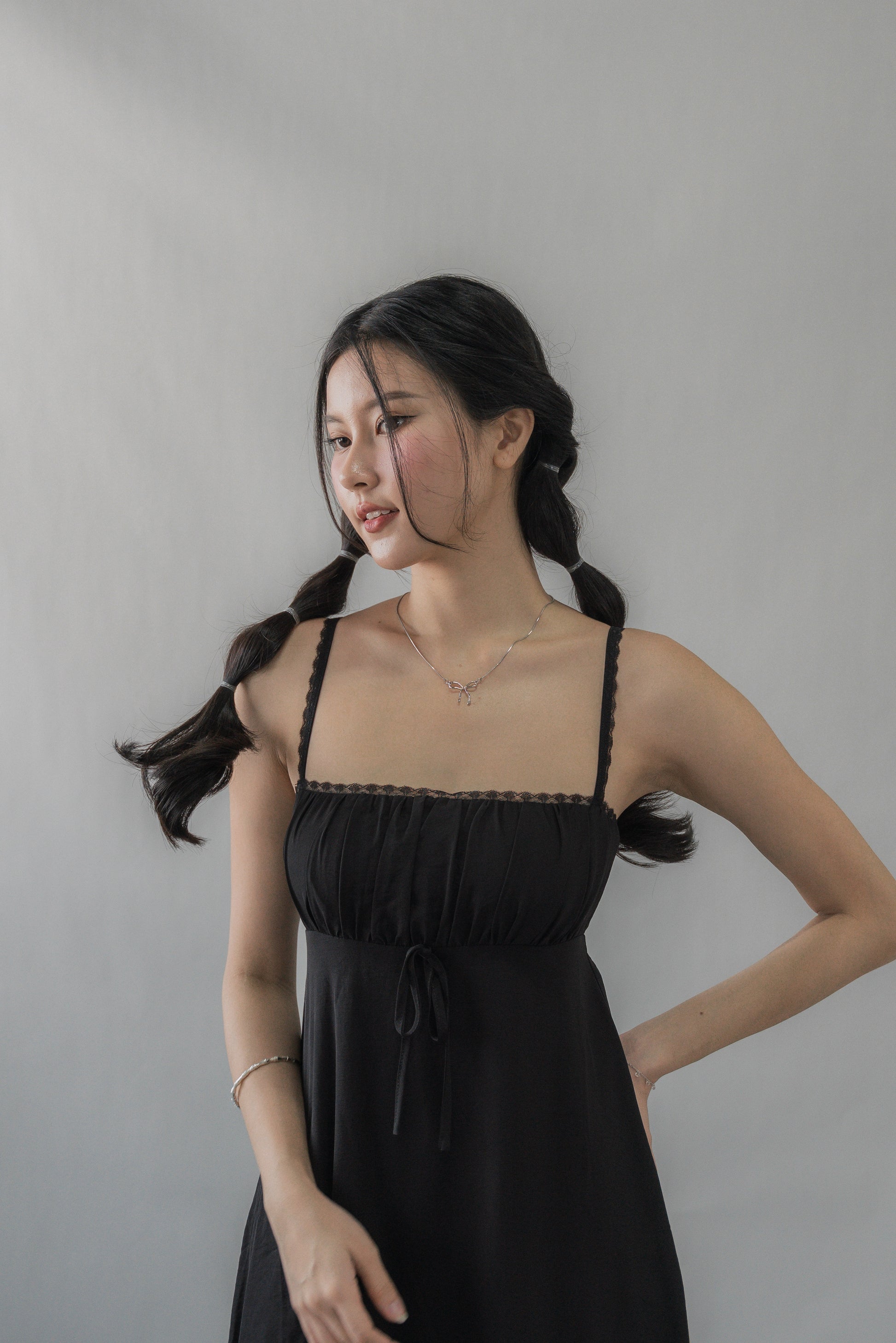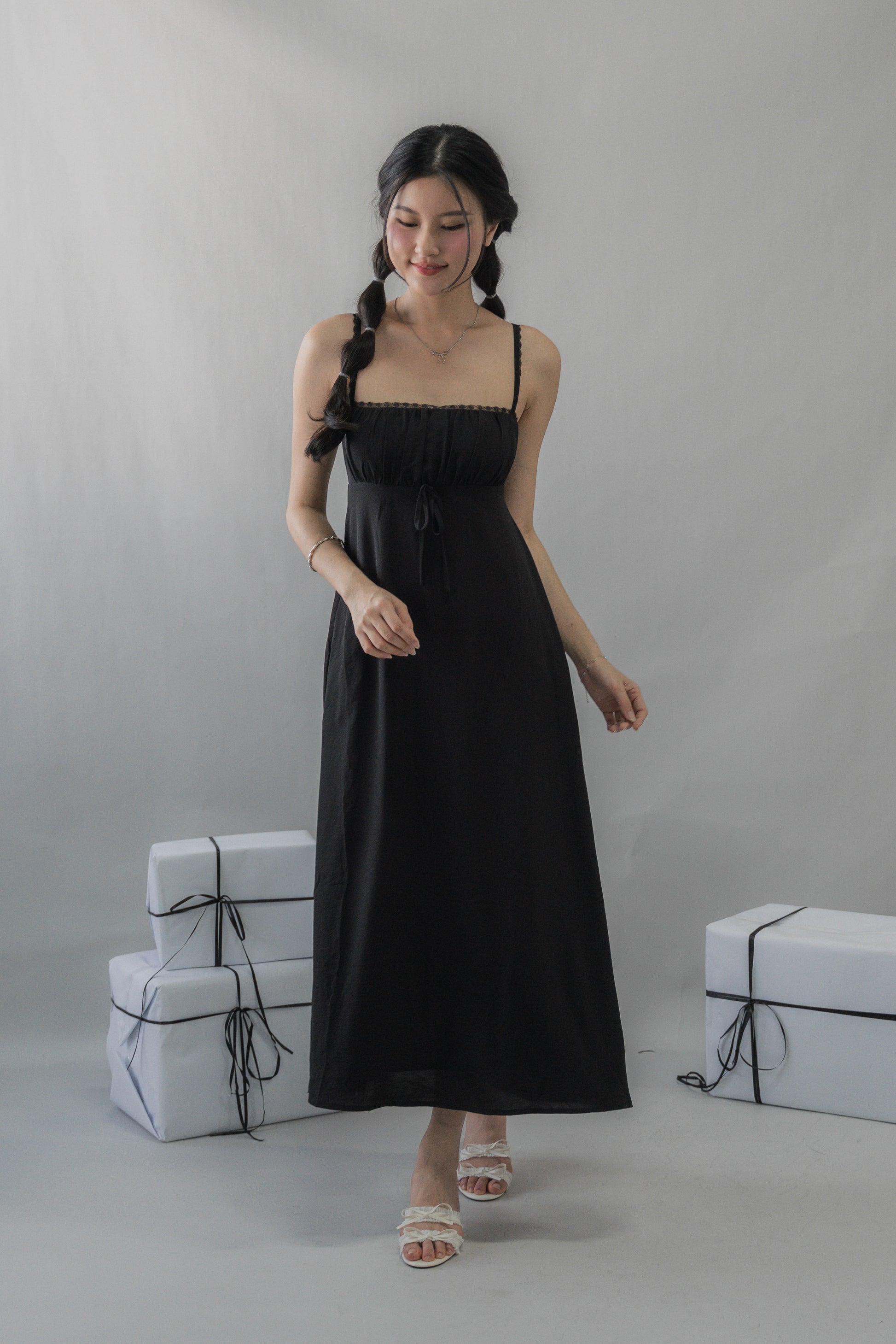 Kate – Romantic ease in every detail. With delicate lace-trim straps, a gathered bodice, and a dainty ribbon tie at the front, Katherine exudes soft femininity in a flowing maxi cut. Lightly padded for fuss-free wear and designed with hidden pockets, it’s the kind of dress that takes you from dreamy afternoons to elegant evenings with timeless grace.