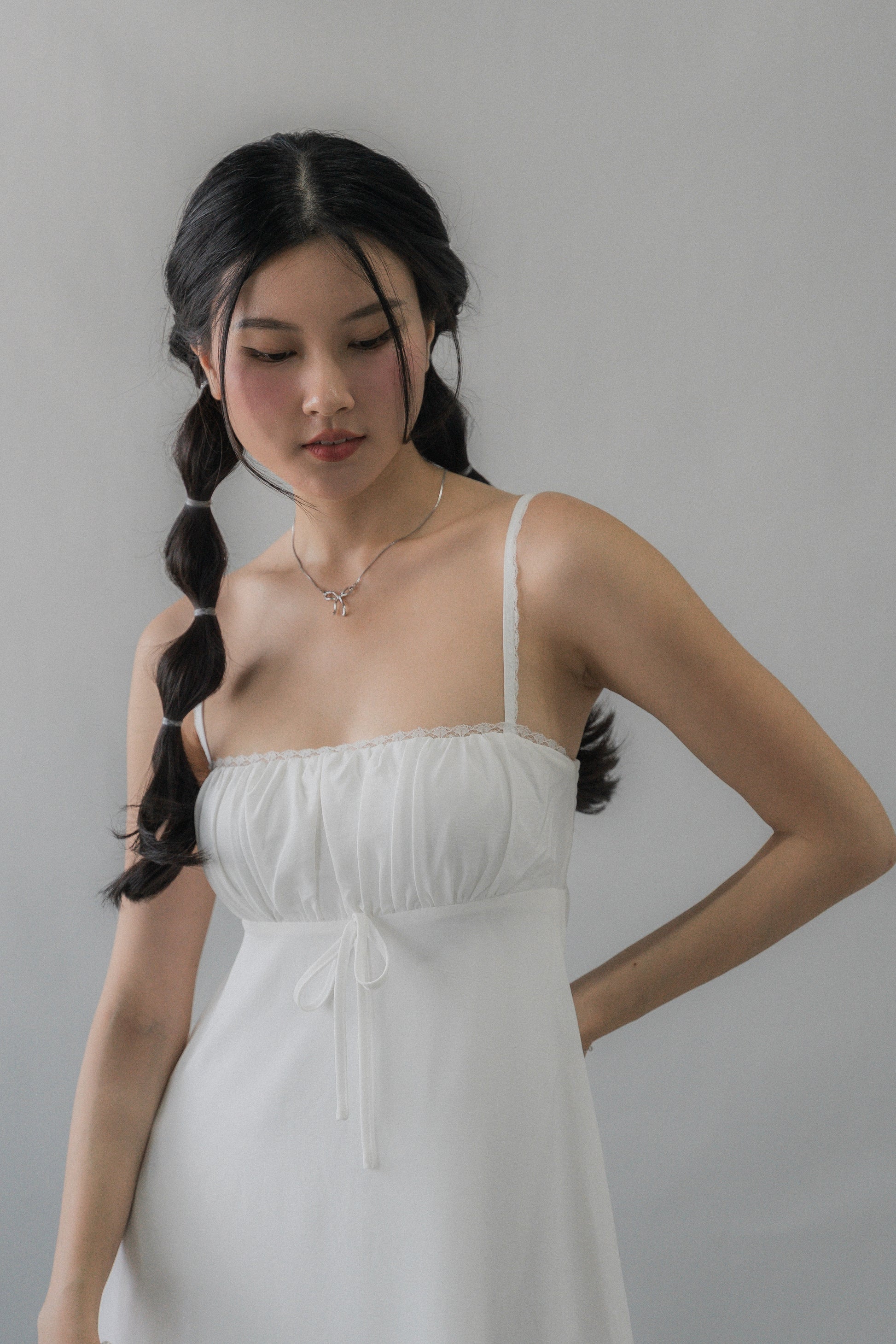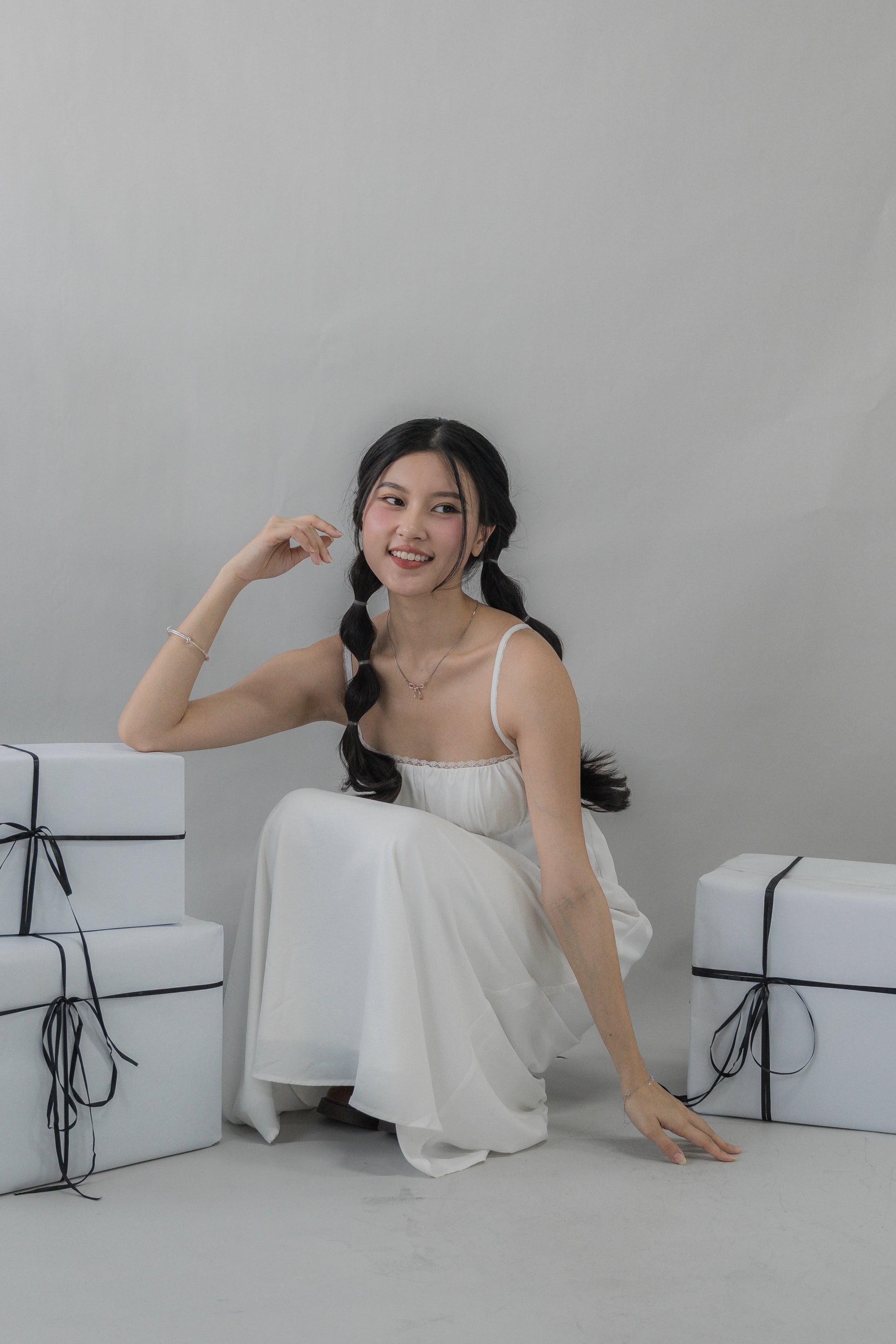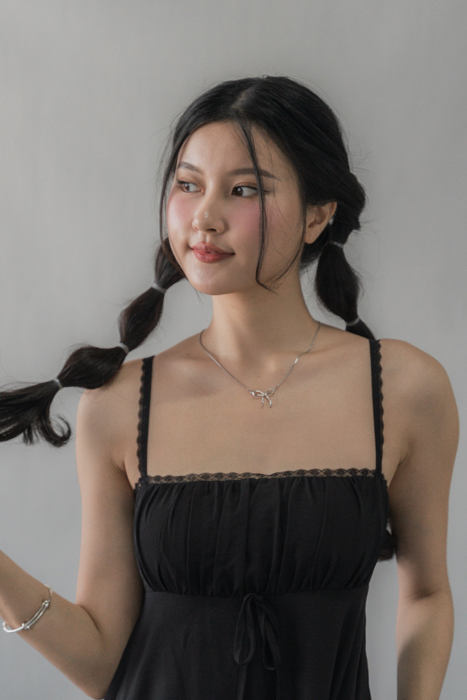 Kate – Romantic ease in every detail. With delicate lace-trim straps, a gathered bodice, and a dainty ribbon tie at the front, Katherine exudes soft femininity in a flowing maxi cut. Lightly padded for fuss-free wear and designed with hidden pockets, it’s the kind of dress that takes you from dreamy afternoons to elegant evenings with timeless grace.