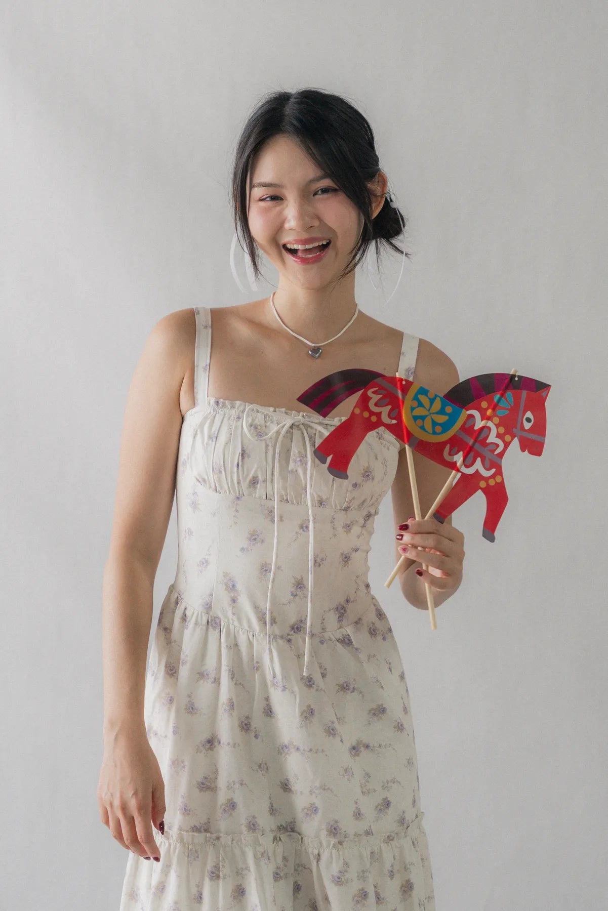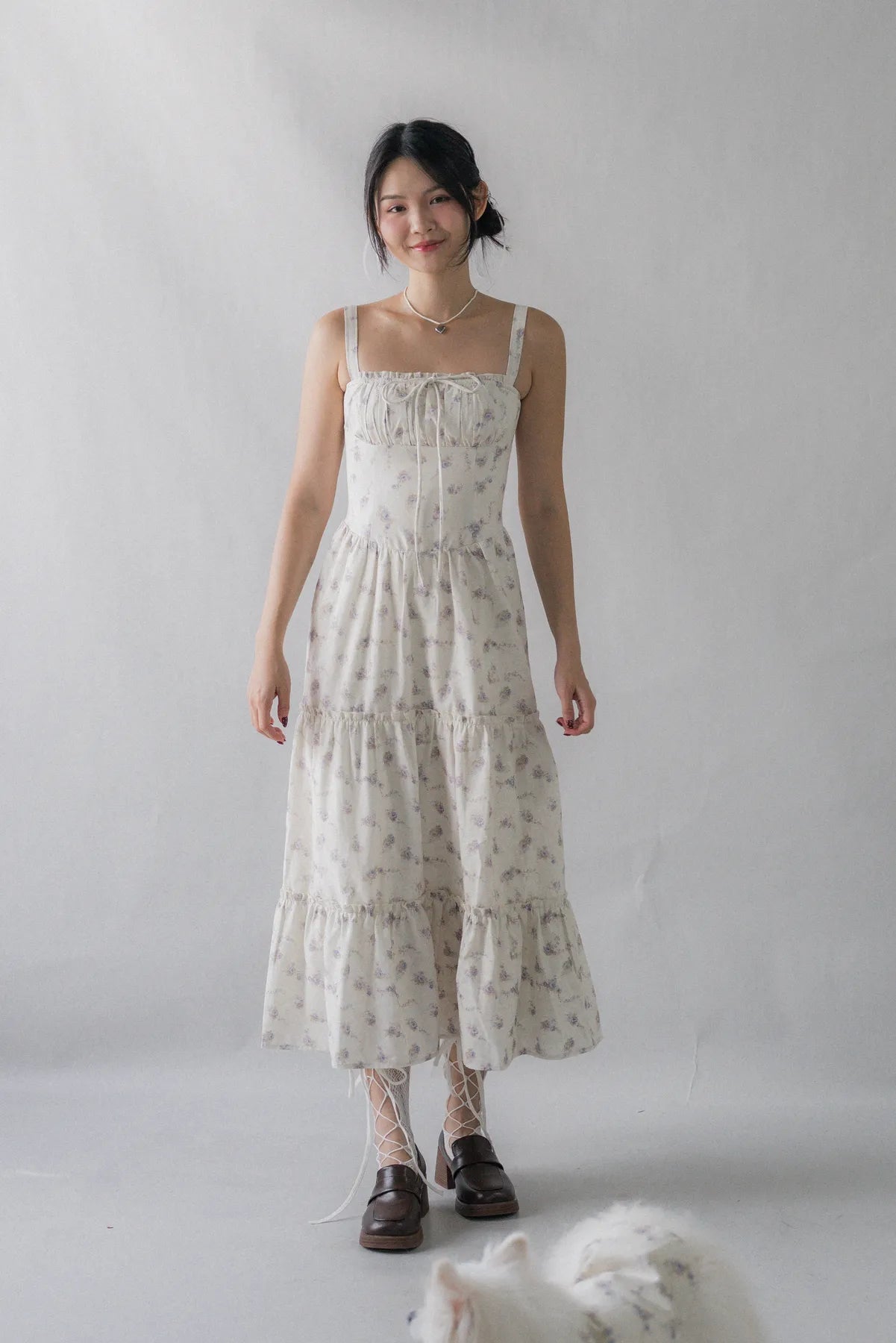 Elegant and flowing, Lyla long dress features a gathered bodice with front ribbon tie detailing and adjustable straps. Designed in our Hana print with a tiered, full-length silhouette, it offers graceful movement with a soft, romantic finish.