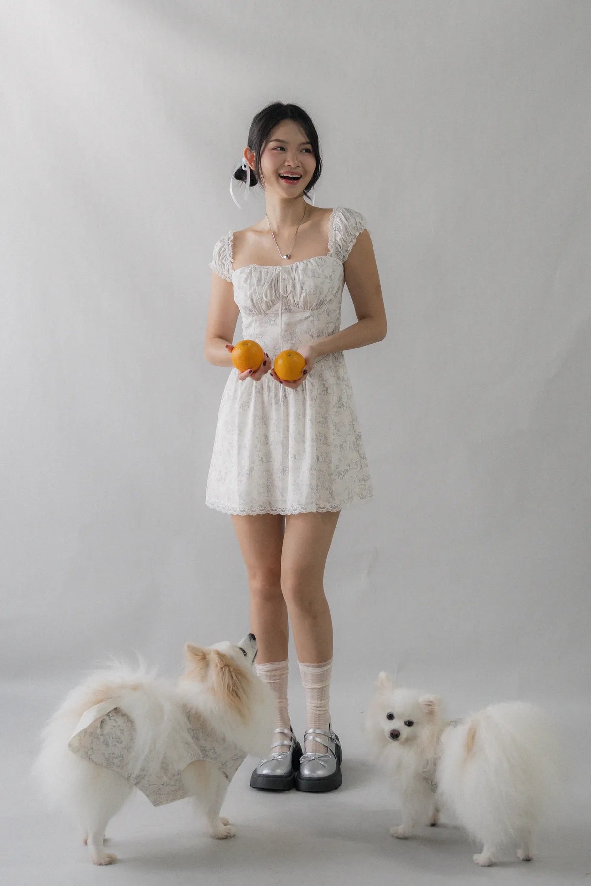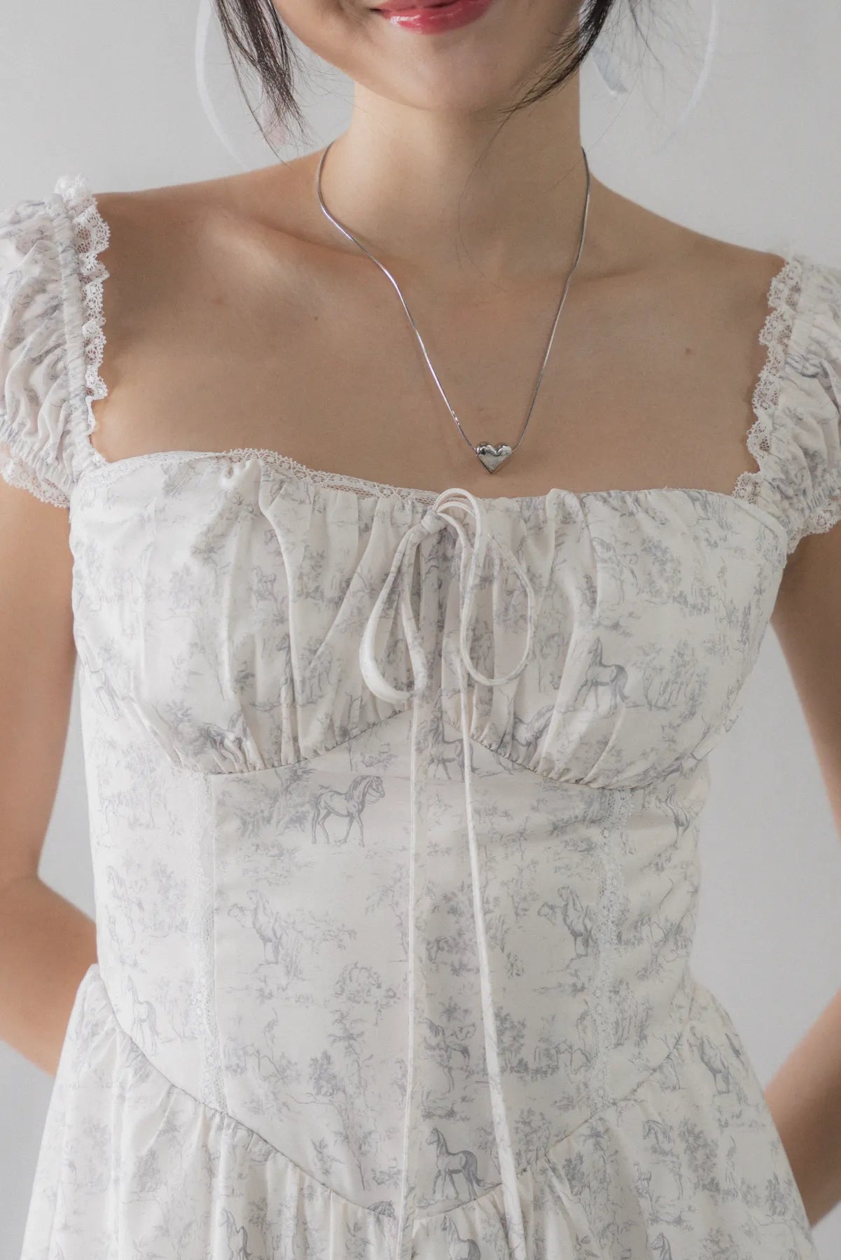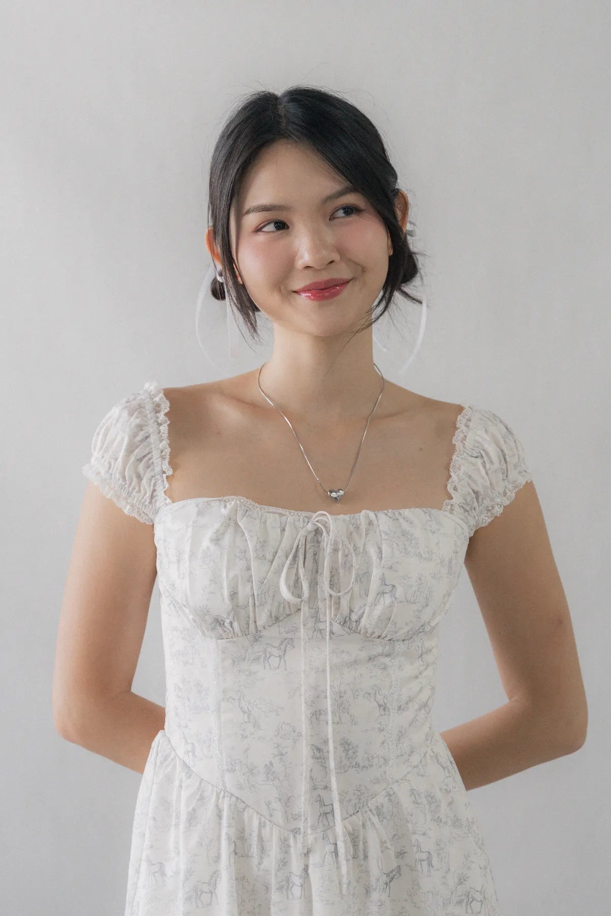 Nikita - features a playful Uma horse pattern print with delicate ribbon tie detailing. Designed in a mini length with softly puffed sleeves, it comes with shorts lining for easy movement. A charming silhouette that balances femininity with festive flair.