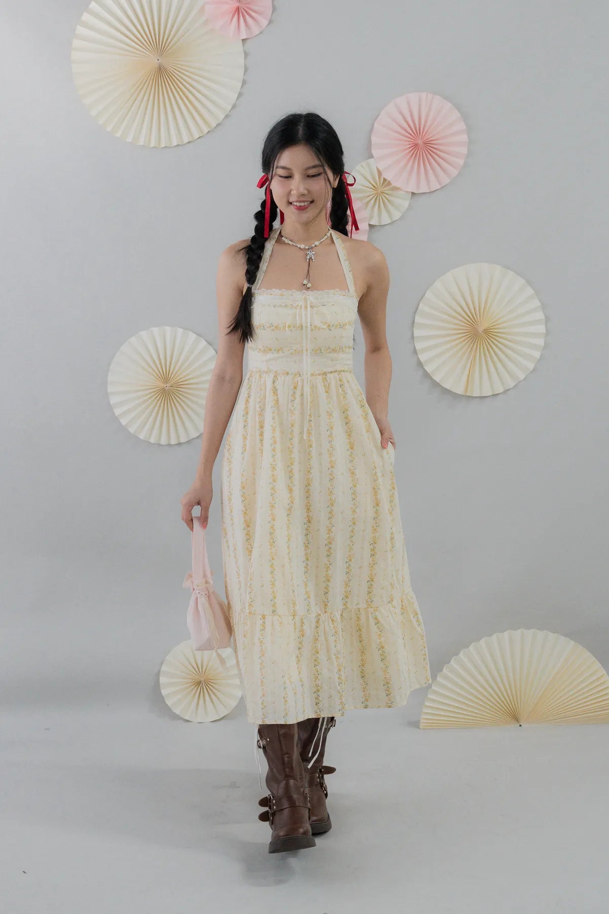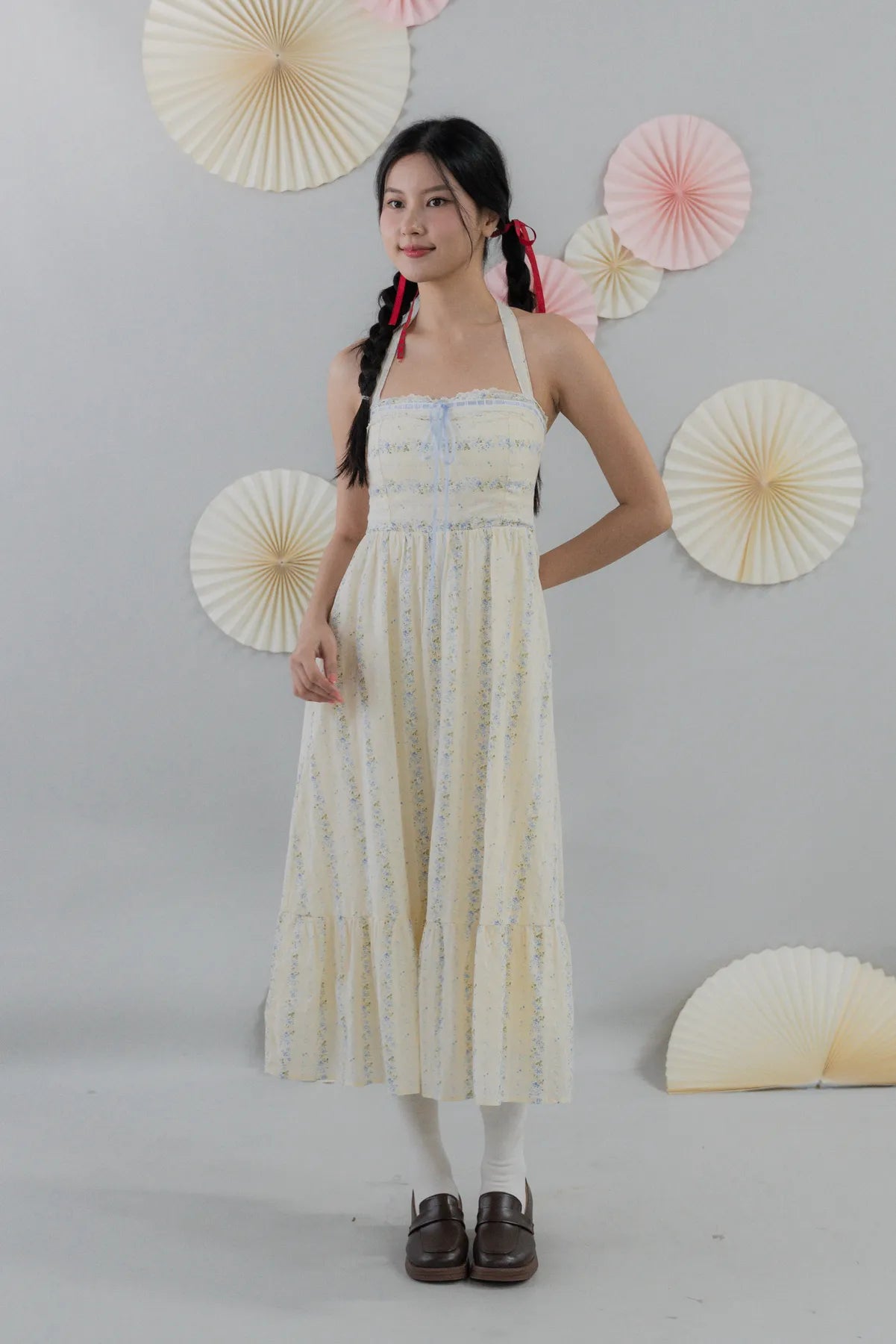Jodi Padded Halter Long Dress features a flattering halter neckline with built-in removable padding for fuss-free comfort. Its flowy long silhouette and delicate ribbon detail create a soft, feminine charm. Available in baby blue and yellow, perfect for garden parties, brunch dates, or festive celebrations.